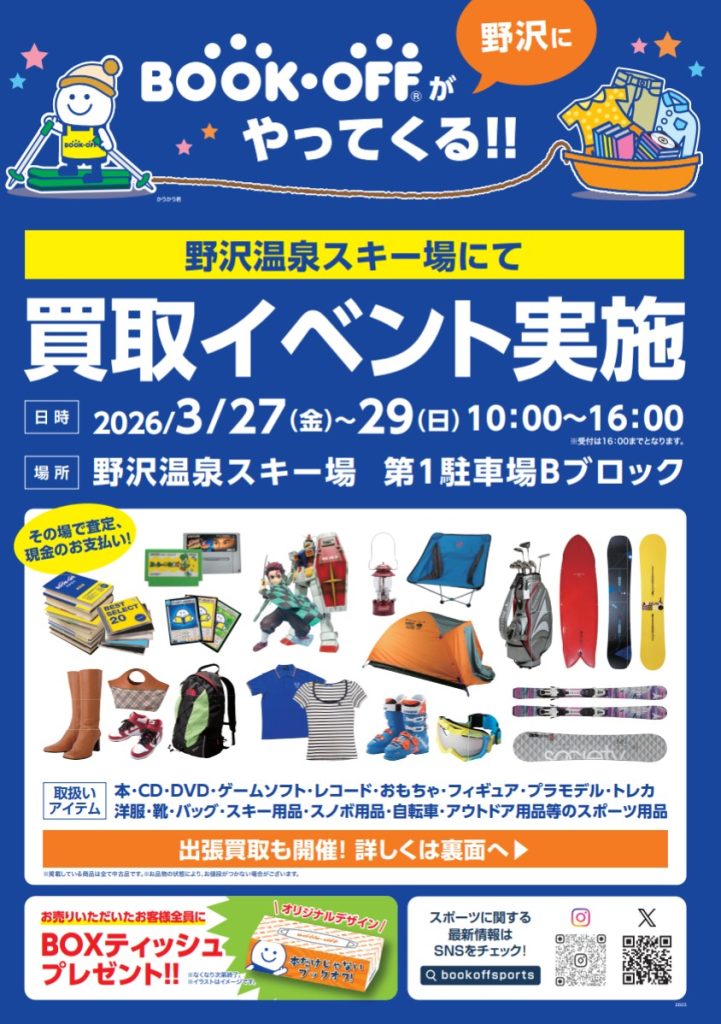 今シーズン使ったギアやアイテムなどお持ち寄りください。なんでもBOOKOFFが出張買取します。