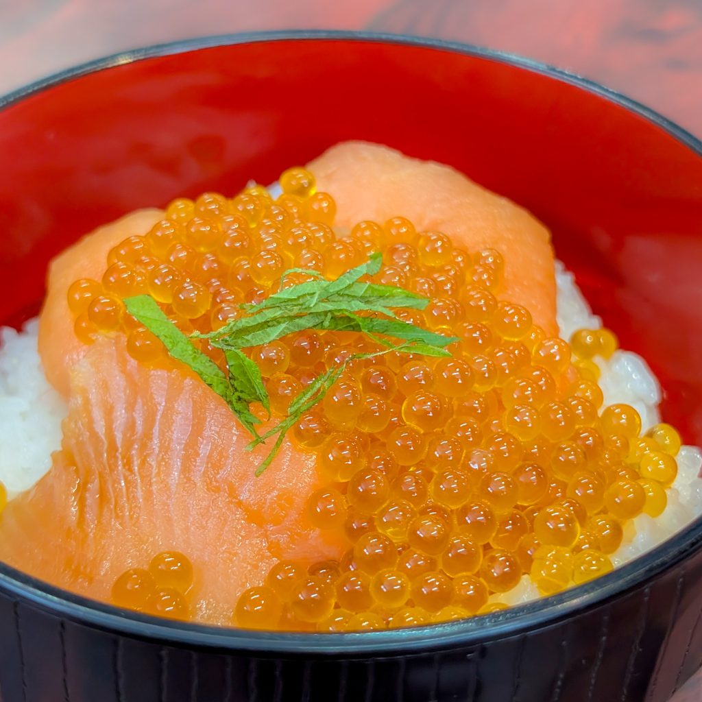 丼にニジマスの漬け切り身をならべ、その上にニジマスのイクラがキラキラと輝く逸品。