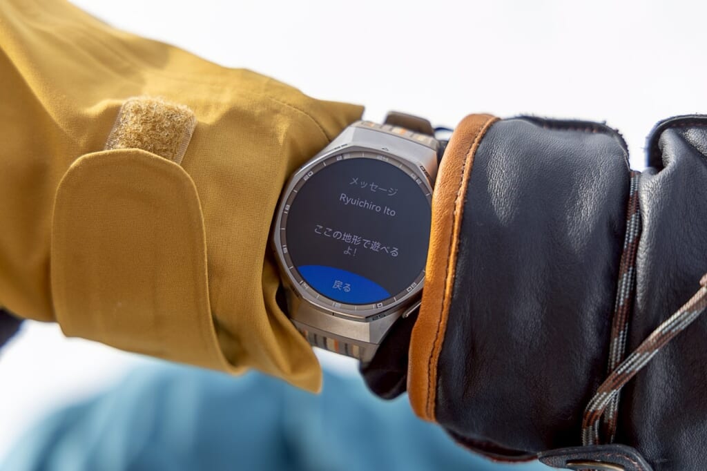 数本滑っていると、山崎さんのウォッチにメッセージ通知が届く。yukiyamaで同じグループに入っているユーザーからのもので、「地形で遊べるよ」という内容だった。「スマホを出さなくてもメッセージに気づけるのはいいね」 そう言いながら手首を軽く回し、内容を確認していた。