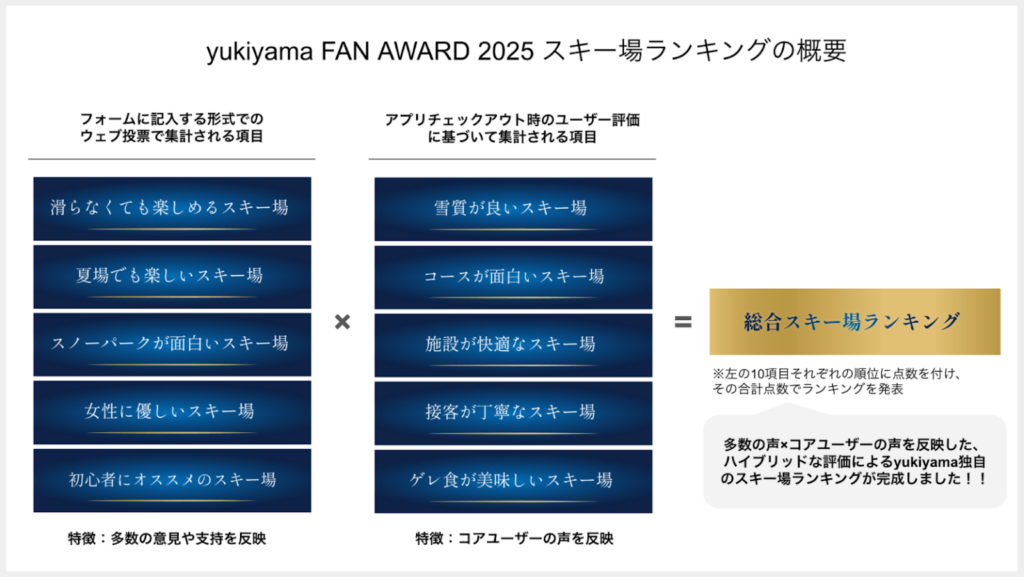 FAN AWARD本編では、全国のスキー場を対象に、過去最多の6,422票と87万件を超えるチェックアウト評価をもとにしたランキングを発表しています。