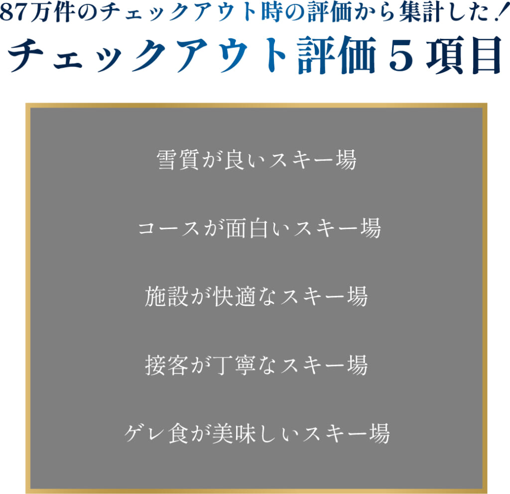 ※総合スキー場ランキングは皆さんのアンケートとチェックアウト評価をポイント化し、決定しています。
